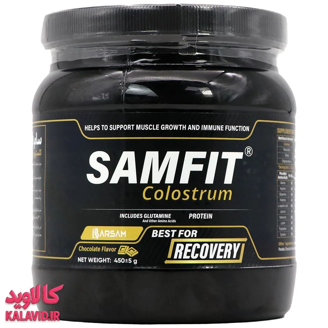 پودر خوراکی کلستروم با طعم شکلات ۴۵۰ گرم سام فیت، مکمل بدنسازی، تقویت سیستم ایمنی، حمایت از رشد عضلانی، مغذی، مناسب ورزشکاران، بدون گلوتن.
