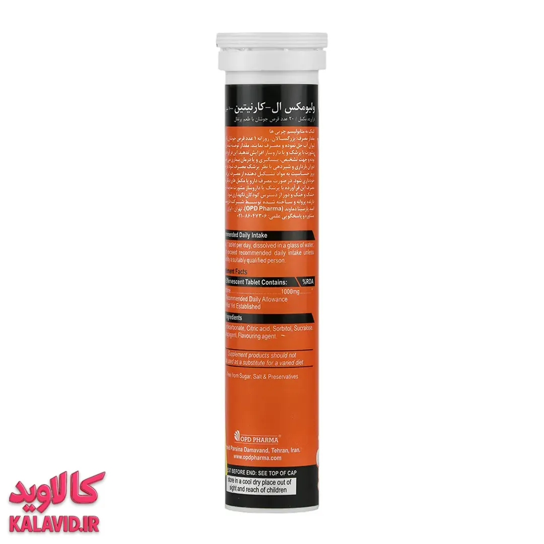 قرص جوشان ال کارنتین ۱۰۰۰ میلی گرم با طعم پرتغال ولیومکس او پی دی فارما